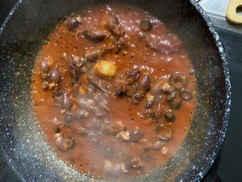 トマトピューレ、ブラックオリーブを入れて煮込む。 全体がふつふつと沸いてきて、とろみがついてきたら一旦火を止める。