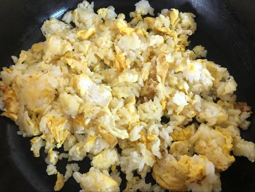 フライパンに分量の油を入れ熱し、割りほぐした卵を入れたら固まる前にごはんを入れる。一度上下を入れ替え、木べらでごはんをほぐすように強火で炒める。卵がごはんをコーティングしパラパラになるよう絶えず混ぜ続ける。家庭のコンロの火力は強くないので、あまり鍋を煽らないほうが、フライパンの温度が下がらずに炒められる。