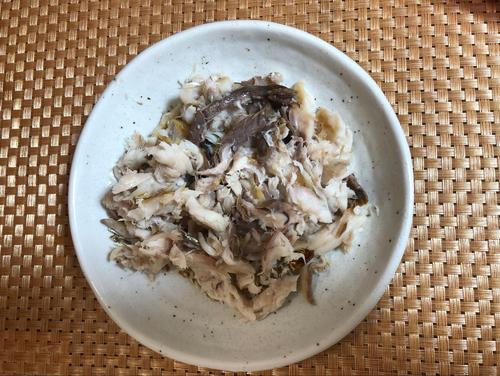 鯵は塩焼きにして身をほぐす。もし、少し臭いが気になるようなら、バットに置き、薄く塩をふって冷蔵庫で20~30分置くと、水分と一緒に臭みが抜ける。焼き上がった鯵の骨を丁寧に取り除く。骨が残ると危険なので、注意深く骨を取り除く。