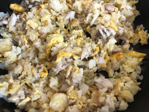 ごはんがある程度パラパラになったら、玉葱と鯵を入れて炒め合わせる。塩、中華出汁の素、胡椒で味を整える。玉葱が透明になったら、醤油を回し入れる。長葱を加え、よく混ぜれば完成だ。