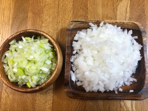 長葱と玉葱はみじん切りにする。あまり細かくしすぎると、存在感がなくなってしまうので2~3mmの少し粗めのみじん切りにしておく。長葱は包丁の刃先で細かく目を入れてから切ると簡単にみじん切りに出来切る。