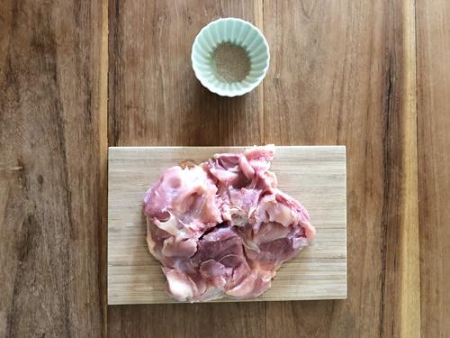 鶏もも肉の身の厚い場所には切り込みを入れ、厚さが均一になるようにする。両面に塩、こしょうをふり全体になじませる。