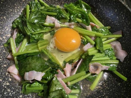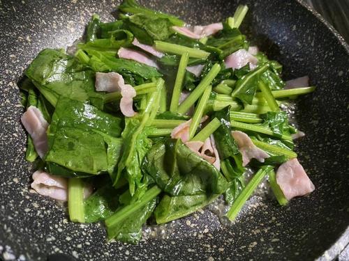 ほうれん草を加え、塩少々(分量外)を入れ、さっと炒める。