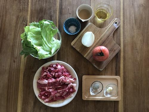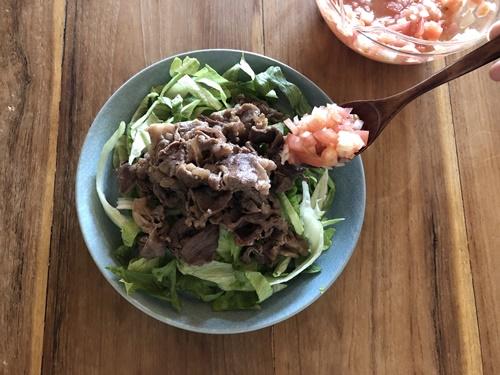 レタスを食べやすい大きさに細切りにし、皿にしいて、炒めた牛肉をのせる。トマトドレッシングをかけて完成。
