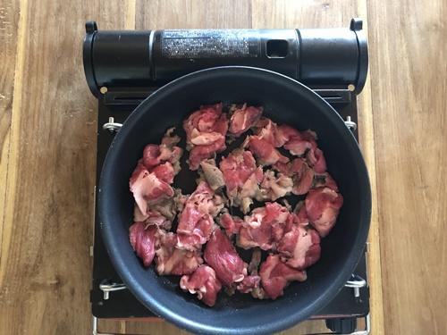 フライパンに牛肉、すりおろしにんにく、塩コショウを入れて炒める。