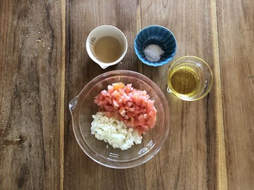 トマト、玉ねぎをみじん切りにし、ボウルに入れてオリーブオイル、酢、塩を合わせてよく混ぜる。