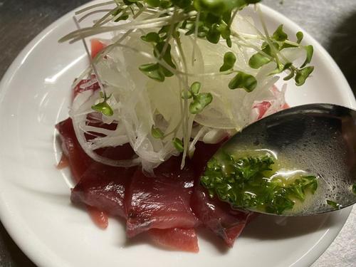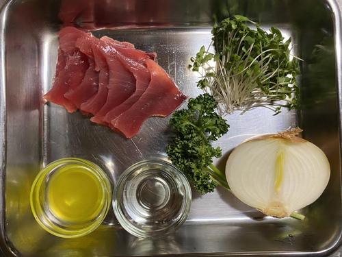 Step.4 鰹の刺身を盛り、上に野菜を盛り付け、ソースをかける