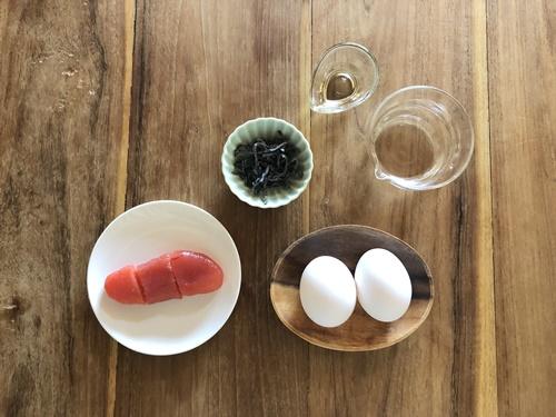 ボウルに卵と塩昆布、水を入れて混ぜる。たらこは混ぜずに、1cm角程度に切る。