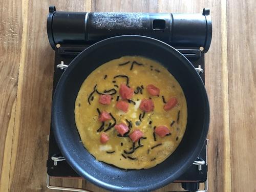 フライパンに油を入れて熱し、温めたフライパンに卵液の1/3を流し入れる。切ったたらこを全体にちらす。