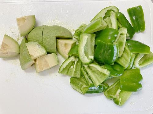 ピーマンは種をとり1/4程度に切り、アボカドは皮をむき種をとったら一口大に切る。