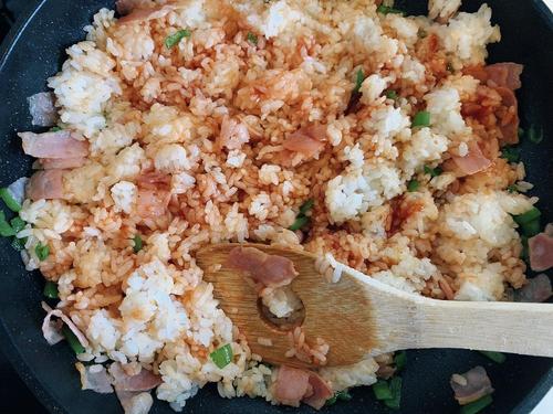 ごはんを加えて、ケチャップとコンソメ顆粒で味を調える。