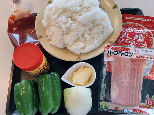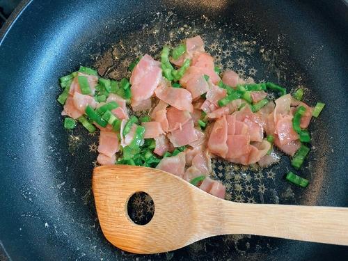 フライパンにバターをひいて、ピーマン、たまねぎ、ベーコンを炒める。鶏ガラスープの素を加えて、しっかりと味を付けておく。