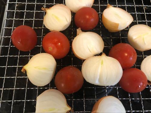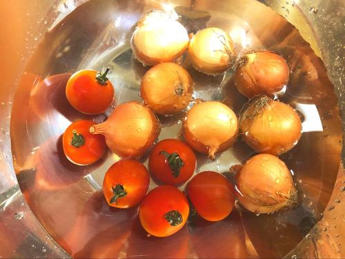 野菜を洗い終わったら、包丁で切っていく。ペコロスは根を落とし、縦半分に切る。大きいようであれば3等分に切っていく。プチトマトはヘタを落とし、爪楊枝で穴を1~2箇所開けておく。