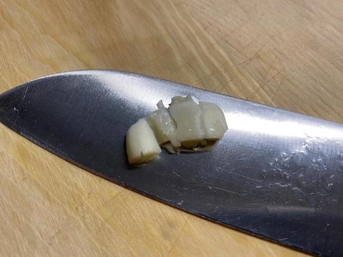 にんにくは包丁の背をあてて押してつぶす。