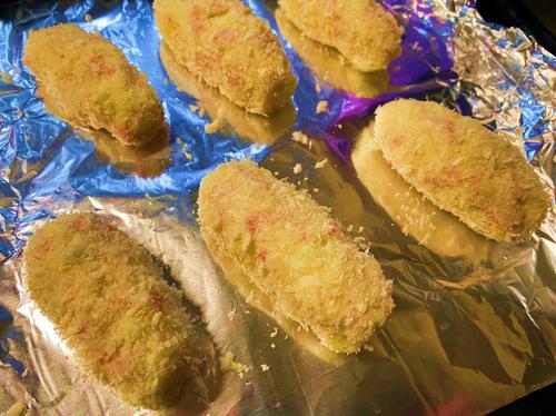 マッシュポテトをスティック形に成型し、煎ったパン粉を周りにつけて天板に並べる。