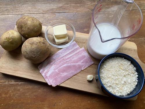 つぶしたじゃがいもに、牛乳、にんにくを入れて煮込む。