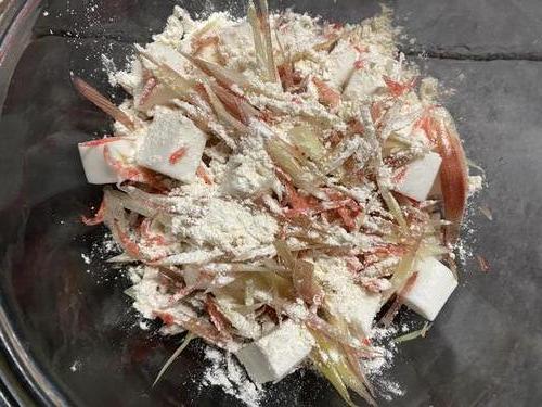 小麦粉と水を混ぜて衣を作り、事前に混ぜておいた材料と合わせる。