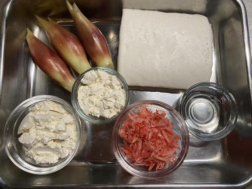 下準備したみょうが、はんぺん、干しエビをボウルに入れて混ぜ合わせる。