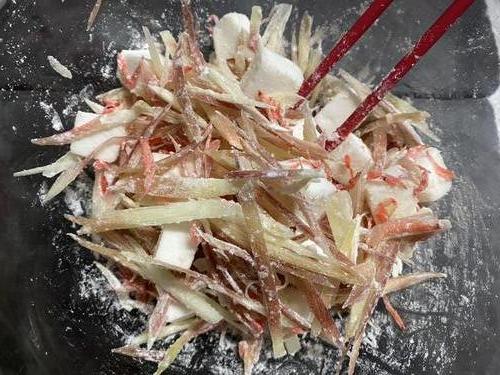 打ち粉を加えて全体を混ぜ合わせる。衣と合わせる前に打ち粉を全体に絡ませることで、揚げた時にサックリと仕上がりやすい