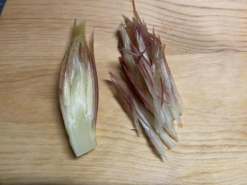 みょうがは土をキレイに洗い、縦半分に切ってから細く千切りにする。