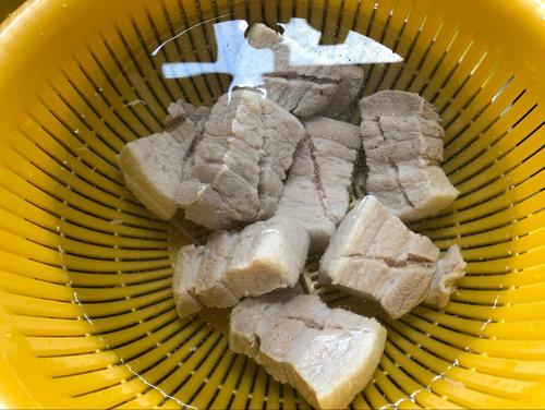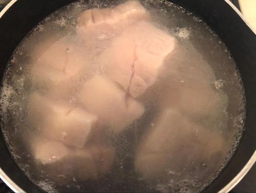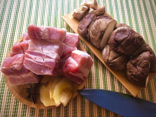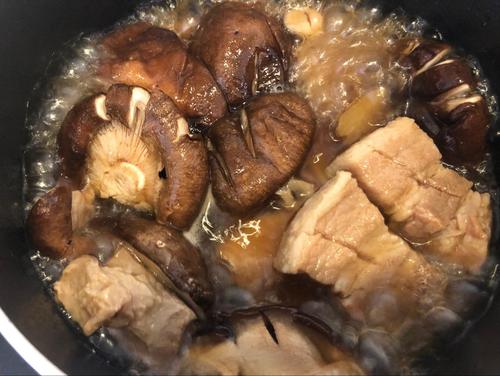 下茹でし、汚れをとったら味入れをして煮込んでいく。はじめに酒、砂糖、大さじ2の水、生姜、八角を入れて40分弱火で煮込む。水分が減ってきたら都度水を足していく。豚肉がある程度柔らかくなったら?油としいたけを加え弱火で20分煮込む。