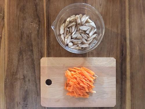 ごぼうは包丁の背で皮をこそげ、ささがきにする。水にさらしておく。人参はピーラーで皮をむき、細切りにする。