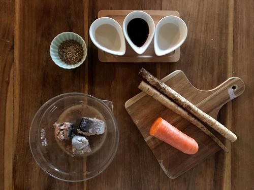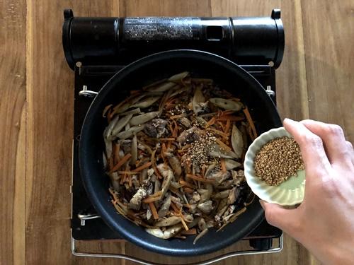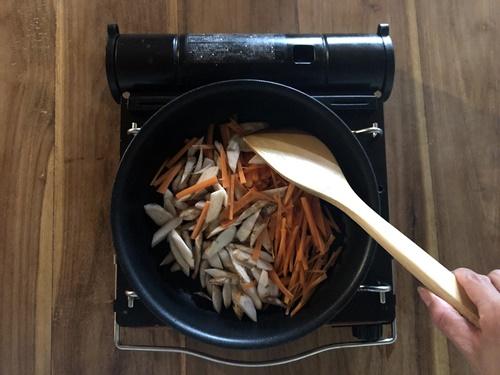 フライパンに油(分量外)をひき、水気を切ったごぼうと人参を入れて油がなじむまで炒める。