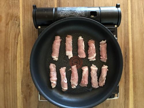 薄く油(分量外)をひいたフライパンに豚肉巻きを入れて中火で加熱する。最後に塩・こしょうで味を整える。
