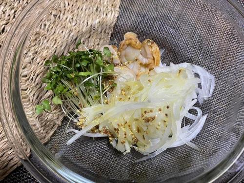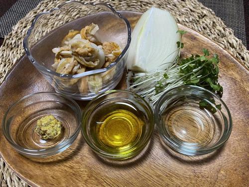 酢、オリーブオイル、粒マスタードを混ぜてドレッシングを作る。