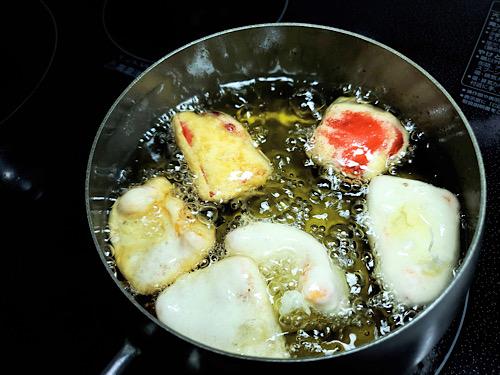 160℃に熱した油で両面じっくりと揚げる。衣が垂れたり偏ったりしないよう、ひとつずつくぐらせて揚げるといい。最初は沈んでいるが、浮いてきたらひっくり返してきつね色になったらバットなどにとる。