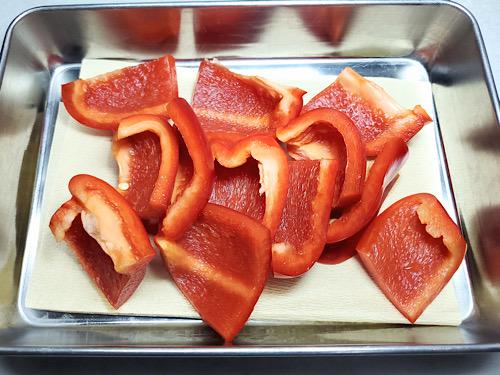 火の通りが均一になるようにするため、パプリカは同じ大きさになるように切りそろえる。