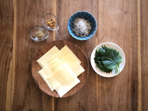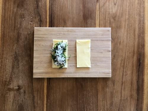 とろけるチーズを半分に切り、大葉としらすをのせてはさむ。