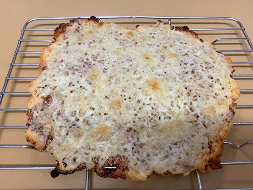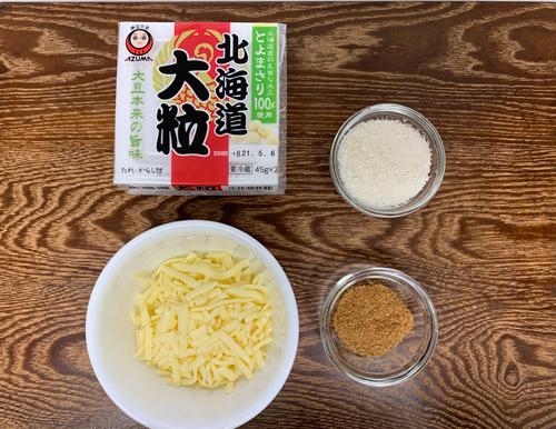 納豆シートがちょうど収まるくらいの浅型トレイを作る。まずアルミホイルを2重にして、20cm×25cm大に切る。納豆シートの上側のラップをまず剥がし、アルミホイルを上からかぶせてひっくり返す。残りのラップも静かに剥がし、ホイルの四隅を折って立てる。 ココナッツフレークをふりかけ、さらにチーズを全面にのせる。 グリラーまたはオーブンを270度に熱し、4分焼く。220度に下げて2分、さらに200度に下げて2分焼く。チーズからブツブツと出ていた大きな泡が出なくなった頃が焼き上がりのタイミング。焦げすぎないよう、状態を見ながら温度調節する。