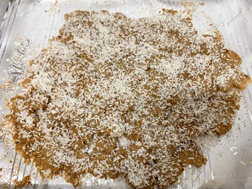 焼き上がりは甘い香りがしており、納豆のにおいはまったく感じられない。黒く焦げた部分は苦いので、手で折り取っておく。網の上で粗熱を取ったら、3cm角の大きさに切り、皿に盛りつける。ココナッツの香りは冷めると消える。シートの四隅はカリカリ、真ん中部分はややしっとりした仕上がりになる。