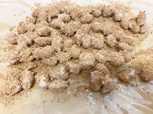 Step.1 納豆を薄くのばし、煎りぬかをふりかける
