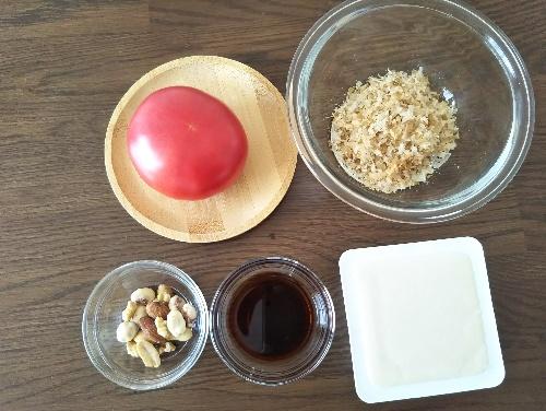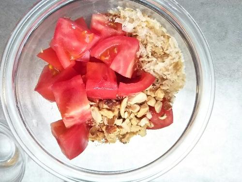 ナッツが細かくなったらボウルに入れ、トマト、かつおぶしと合わせる。