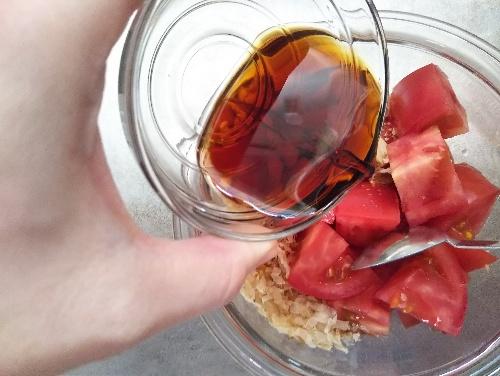 切る前に軽くもんでおく事によって、トマトの実が柔らかくなり味がしみ込みやすい。