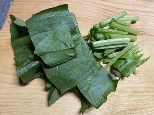 サラダほうれん草は水でキレイに洗い、食べやすい大きさに切る。