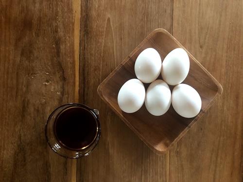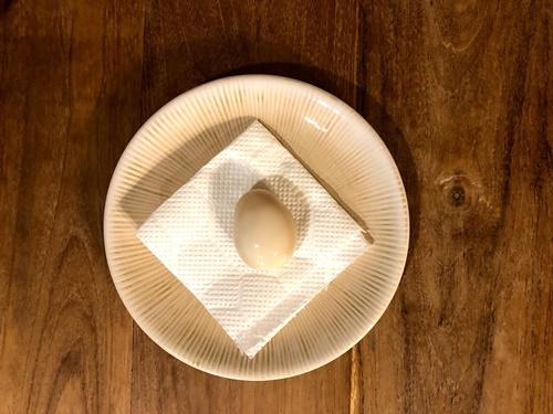 鍋に卵とおたま一杯の水を入れ、ふたをして火にかける。沸騰したら弱火で6分加熱する。すぐに流水で冷やし、粗熱をとって殻をむく。