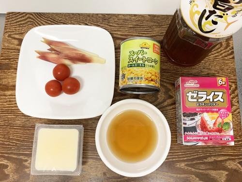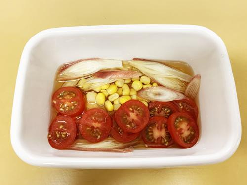 みょうがとプチトマトは薄切りにし、コーンとともにに10分程度浸す。