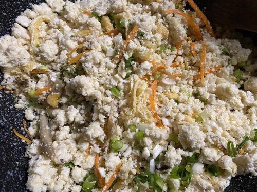 おからの水分がとんだら、長ネギ、万能ネギを入れて混ぜる。
