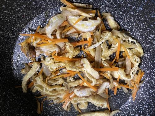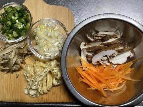 (水気を切ったごぼう、にんじん、しいたけ、油揚げの順。)