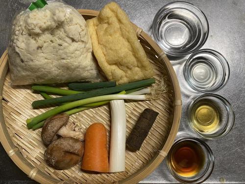 油揚げは油抜きをして細く切り、長ネギ、万能ネギはそれぞれ細かく切る。