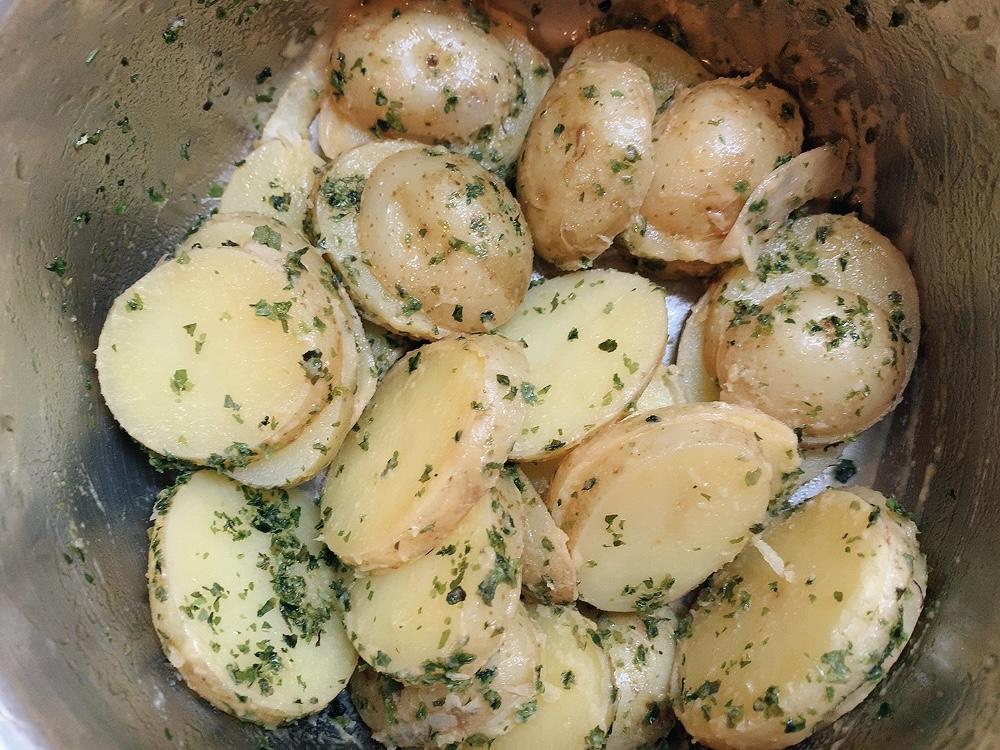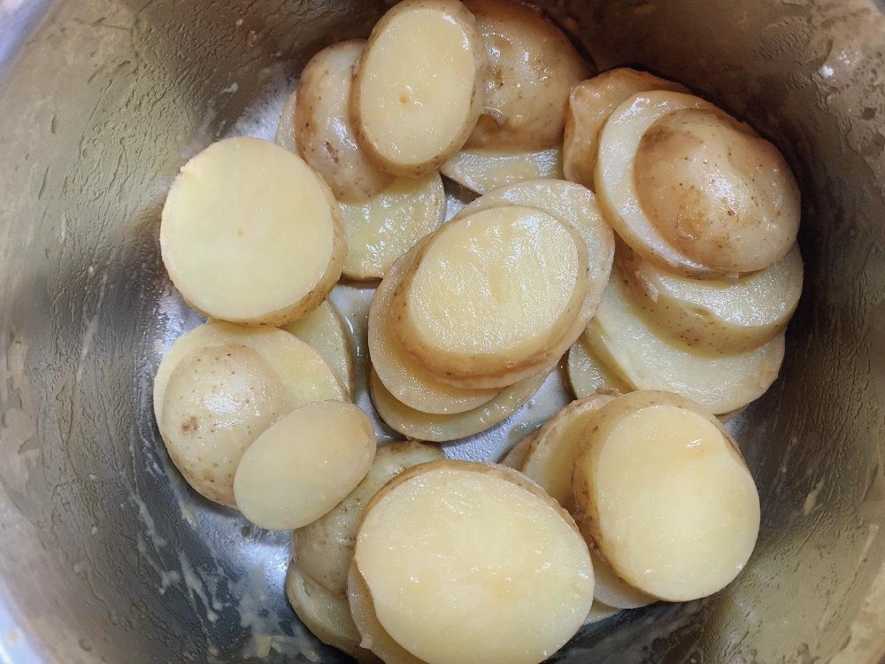 新じゃがはよく洗ってから、輪切りにして、水にさらしてアク抜きをしておく。