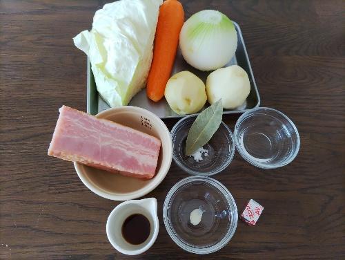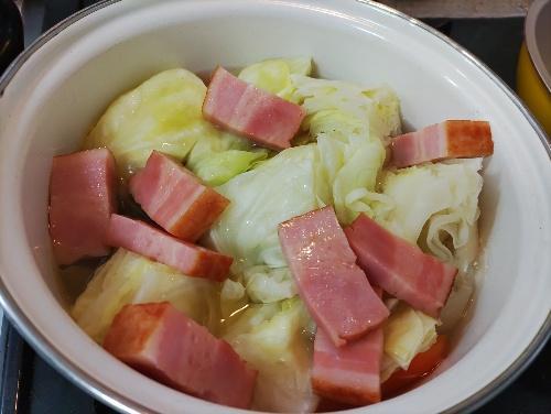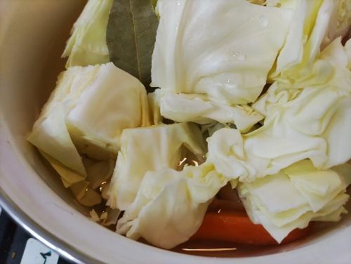 玉ねぎ、にんじん、じゃがいもを鍋底にぎゅうぎゅうに敷き詰めるように入れると煮崩れしにくい。その上にキャベツをのせる。鍋のふたをして、10分程煮込む。