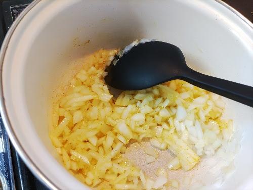 鍋に油を少量入れ玉ねぎ、にんにく、しょうがを弱火でじっくり炒める。