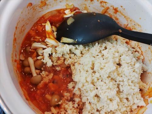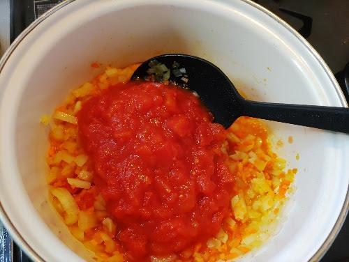 玉ねぎ、にんじんがしんなりしてきたらトマト缶としめじを投入する。