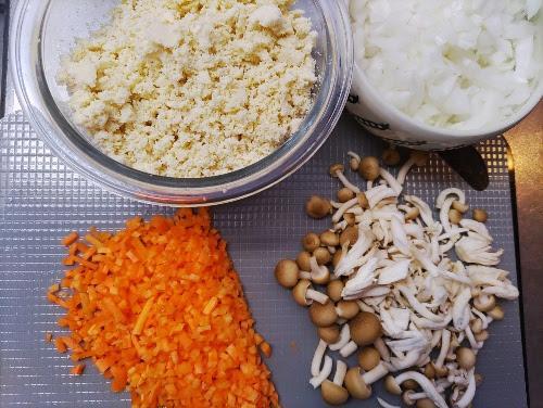 しめじはいしづきを落としてほぐし、1cm程度の長さに切っておく。