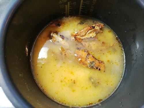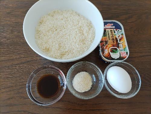 缶詰を汁ごと投入して、炊飯釜内の水をスプーンですくい缶の中をゆすぐようにして、その水を釜に戻す。