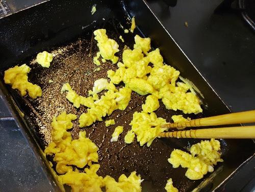 米を炊いている間に、フライパンに油をしき、卵と砂糖を合わせて炒り卵を作る。